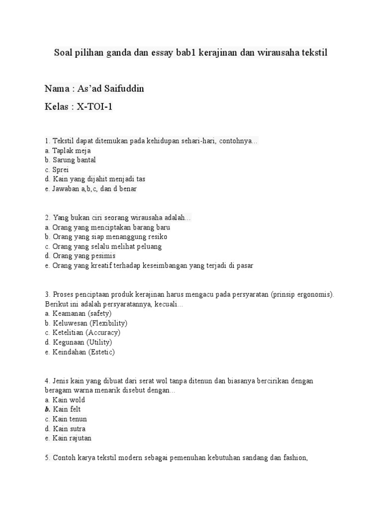 Soal Pilihan Ganda Dan Essay Bab1 Kerajinan Dan Wirausaha Tekstil