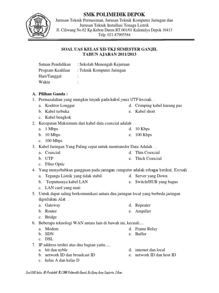 Soal Uas Tkj Kelas Xii Semester 1 Beserta Jawabannya